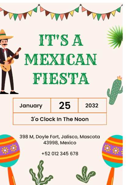 This contemporary design blends vibrant illustrations with bold, modern typography. In addition, the use of playful patterns and color balance adds life to any fiesta event. Consequently, it’s ideal for birthdays, cultural celebrations, or casual get-togethers.